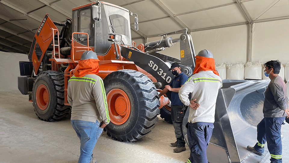 Entre los clientes que posee HD Hyundai Infracore Chile destaca una empresa dedicada al bodegaje de minerales no ferrosos, específicamente ceniza de soda y litio, que obtiene a granel y acopia en sus almacenes para luego llevar a maxi sacos o volver a entregar a granel según los requerimientos que recibe.