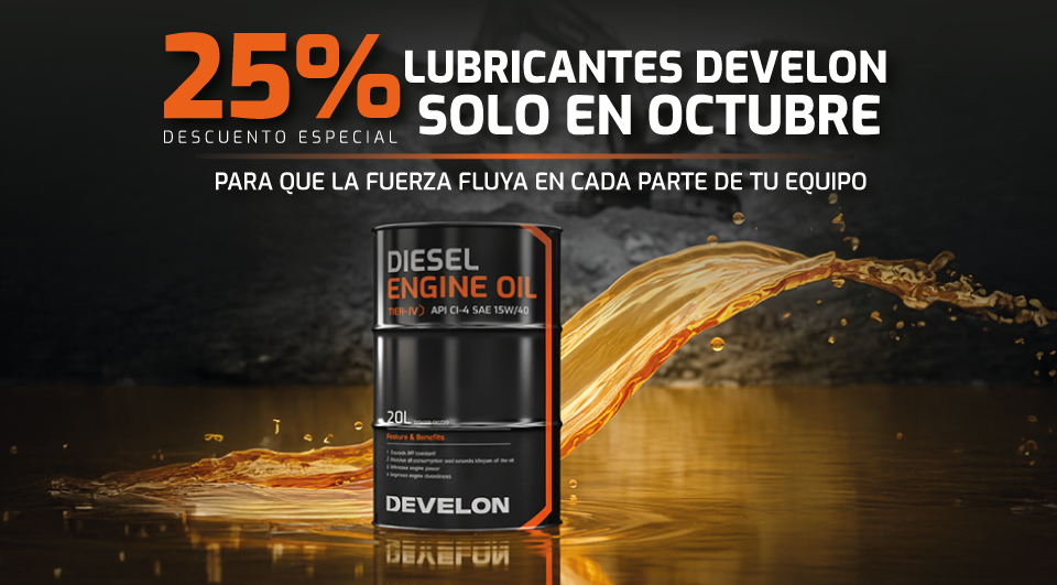La fuerza que fluye en cada parte de tu equipo, durante octubre se encuentra con un 25% de descuento en lubricantes originales DEVELON. Una oportunidad especial para mantener al máximo el desempeño de tu maquinaria, incluso en las condiciones más desafiantes.