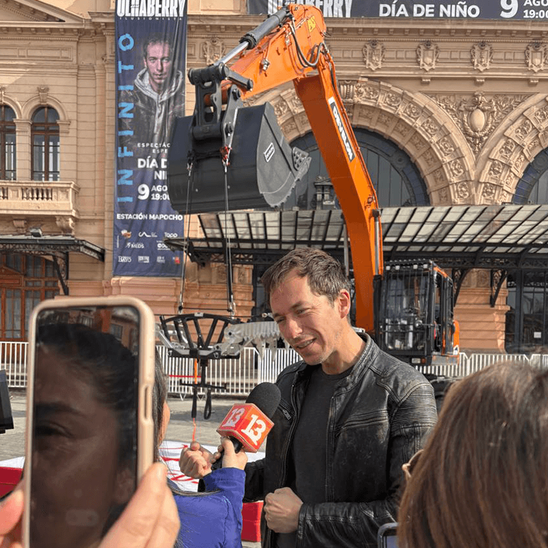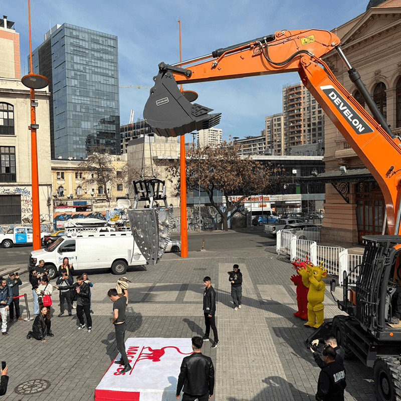 Hoy, dos años después, Olhaberry lo volvió a hacer. Esta vez, en el corazón de Santiago, frente a la emblemática Estación Mapocho, protagonizó una nueva intervención urbana, en la que se colgó con una camisa de fuerza a varios metros de altura, sostenido nuevamente por una excavadora DEVELON. El modelo protagonista fue la DX210W-7, una excavadora sobre neumáticos que destaca por su tecnología avanzada, precisión y estabilidad, reflejo de la calidad coreana que nos caracteriza.